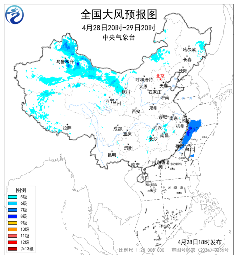 预计,4月28日20时至29日20时,新疆北部和东部以及南疆盆地南部、内蒙古西部、甘肃西部、黑龙江东部、西藏西部等地部分地区有5~6级风,阵风7~8级,其中,新疆北部风力可达7~8级,阵风9级。东海西部海域、浙江南部沿岸海域、福建沿岸海域、台湾海峡北部将有7~8级、阵风9~10级的大风。