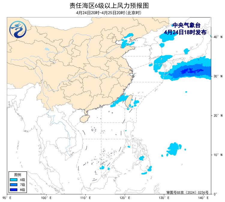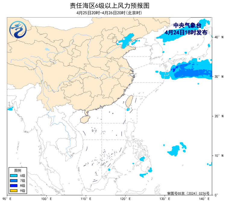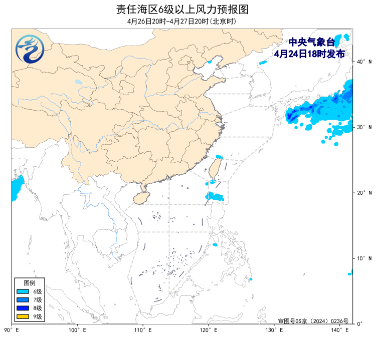 4月24日02时至14时,东海北部海域、台湾海峡出现了5~6级、阵风7级的东北风或偏北风。