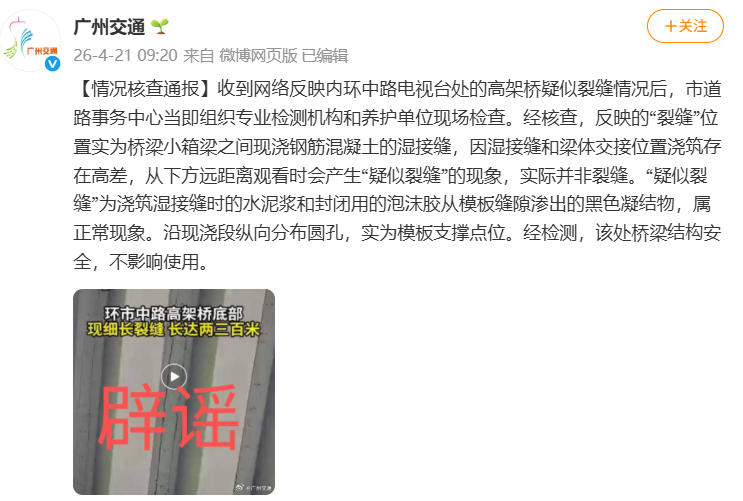 收到网络反映内环中路电视台处的高架桥疑似裂缝情况后,市道路事务中心当即组织专业检测机构和养护单位现场检查。经核查,反映的“裂缝”位置实为桥梁小箱梁之间现浇钢筋混凝土的湿接缝,因湿接缝和梁体交接位置浇筑存在高差,从下方远距离观看时会产生“疑似裂缝”的现象,实际并非裂缝。“疑似裂缝”为浇筑湿接缝时的水泥浆和封闭用的泡沫胶从模板缝隙渗出的黑色凝结物,属正常现象。沿现浇段纵向分布圆孔,实为模板支撑点位。