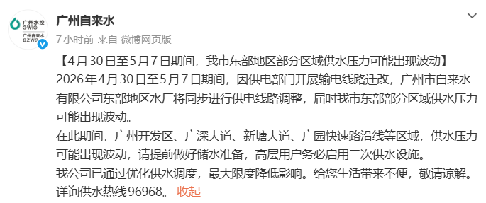 4月28日,广州市自来水有限公司发布消息,2026年4月30日至5月7日期间,因供电部门开展输电线路迁改,广州市自来水有限公司东部地区水厂将同步进行供电线路调整,届时广州东部部分区域供水压力可能出现波动。