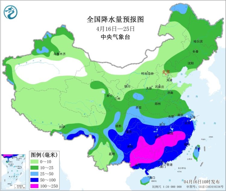 未来10天(4月16-25日),西南地区东部、江南、华南以及西藏东南部等地累计降水量有50~100毫米,其中江南中南部、华南西部及贵州东部的部分地区有110~150毫米;上述大部地区降水量较常年同期偏多3~7成,部分地区偏多1倍以上。