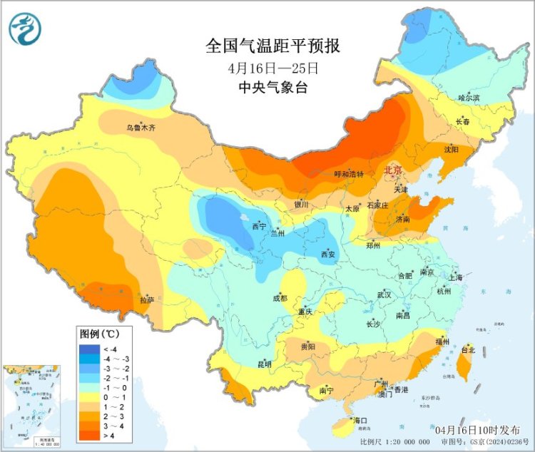未来10天,新疆北部、内蒙古东北部、黑龙江北部以及西北地区东部等地部分地区平均气温较常年同期偏低1~2℃,全国其余大部地区平均气温接近常年同期或偏高1~2℃,其中,内蒙古中西部、西藏西南部、山东等地部分地区偏高3~4℃。