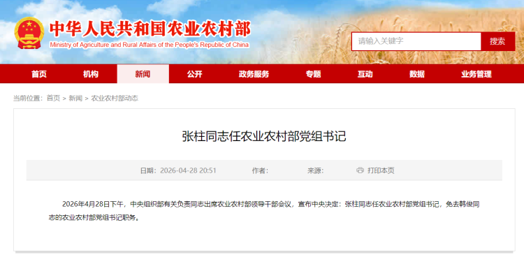 2026年4月28日下午,中央组织部有关负责同志出席农业农村部领导干部会议,宣布中央决定:张柱同志任农业农村部党组书记,免去韩俊同志的农业农村部党组书记职务。